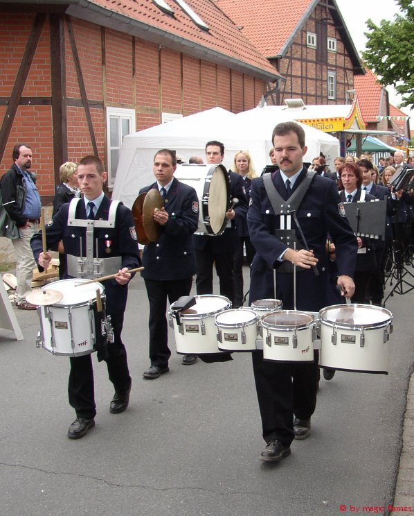 percussAm Samstag, 17. Mai, gratulierte der Spielmannszug zur 850-Jahr-Feier in Heiligendorf. Mehrmals am Tag marschierten die Musiker unter rhythmischer Begleitung der Percussion (Schlagwerkgruppe) durch die Festmeile. Während die Percussion ihr Können mit den Effektstücken zeigte, unterhielt der gesamte Zug die Zuhörer bei Platzkonzerten mit den bekannten Stücken "Sugar Baby Love" und "Lollipop", sowie den beliebten Filmmelodien "I Will Follow Him" aus Sister Act und "The Lion Sleeps Tonight" aus König der Löwen. Auch die Stücke "Califonia Dreaming" und "The Obvious Child", die beim Wettstreit am 1. Mai eine gute Platzierung einbrachten, wurden zum besten gegeben.