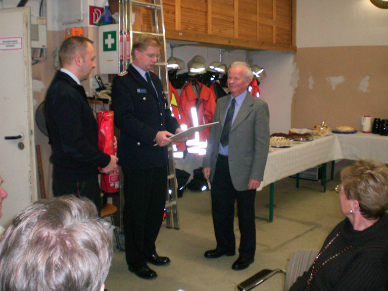 Brandes und Schmidt gaben einen kurzen Überblick, über die im laufenden Jahr stattgefundenen Ereignisse, wie z.B. dem Musikfestival zum 40jährigen Bestehen des Spielmannszuges und berichteten über die geleistete Arbeit. Anschließen folgte die Ernennung von Burghardt Lange zum Ehrenmitglied der Freiwilligen Feuerwehr, da er das 70. Lebensjahr erreicht hat.